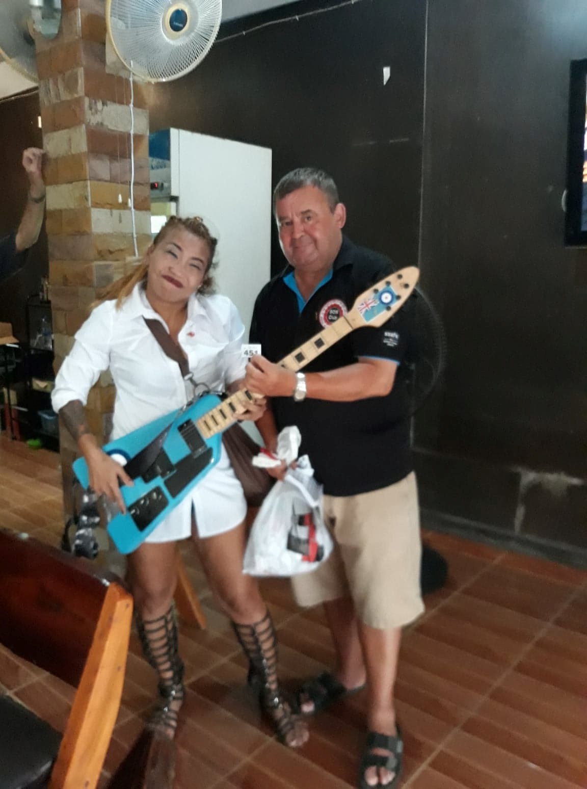 On it’s return the guitar was raffled in Kanchanburi, Thailand on Poppy Day, where there was 600 tickets in the draw. At the last possible moment two more tickets were sold, one of which was the winner, Anna Kandee, a Kanchanaburi lady, member of the SOS, and a qualified guitarist in a rock band.